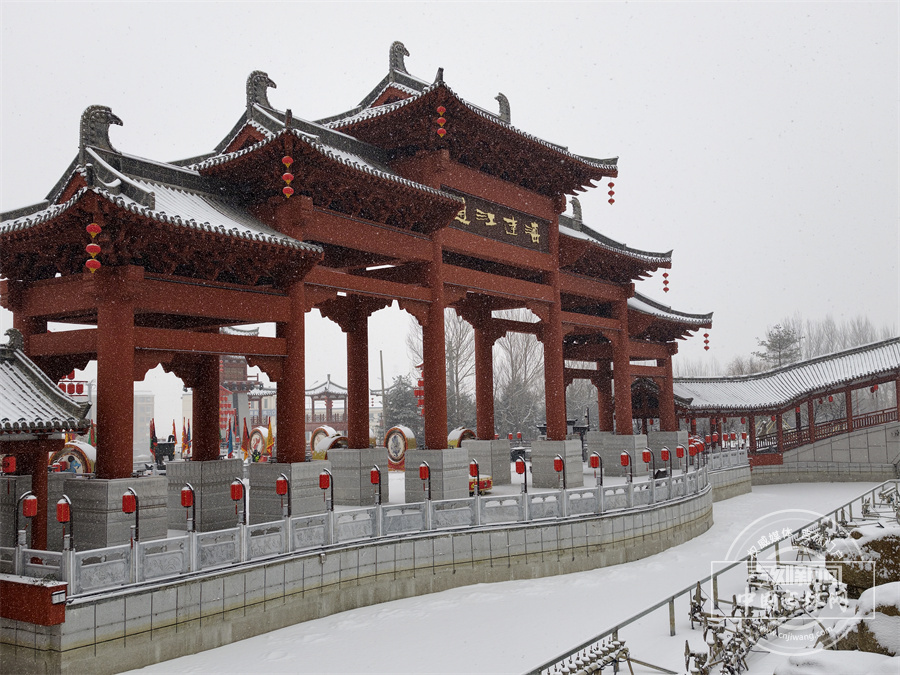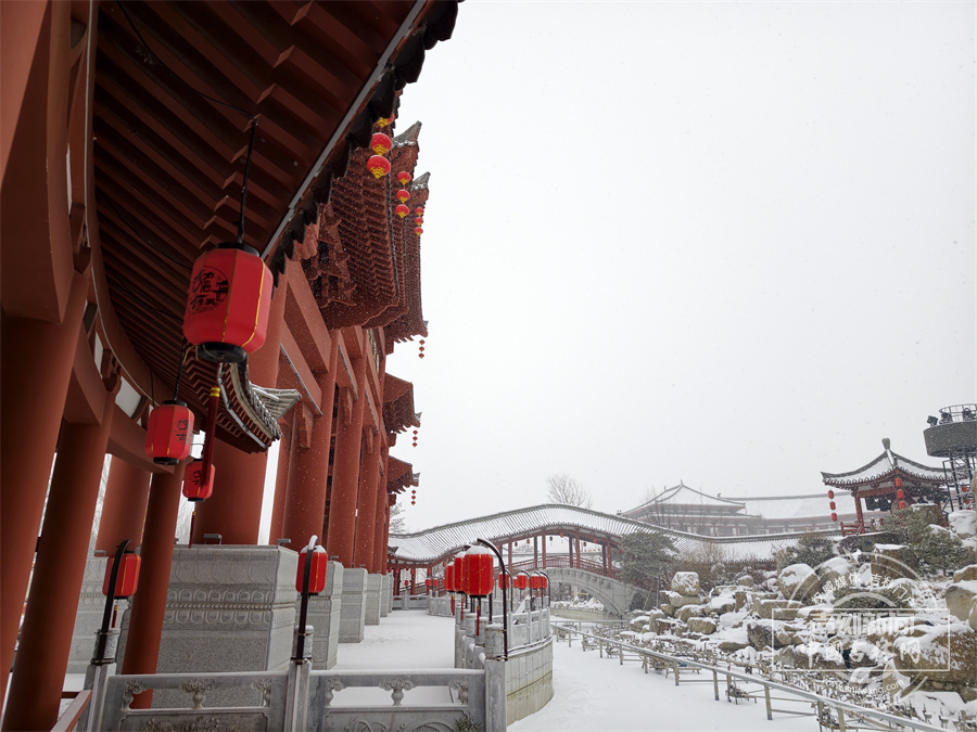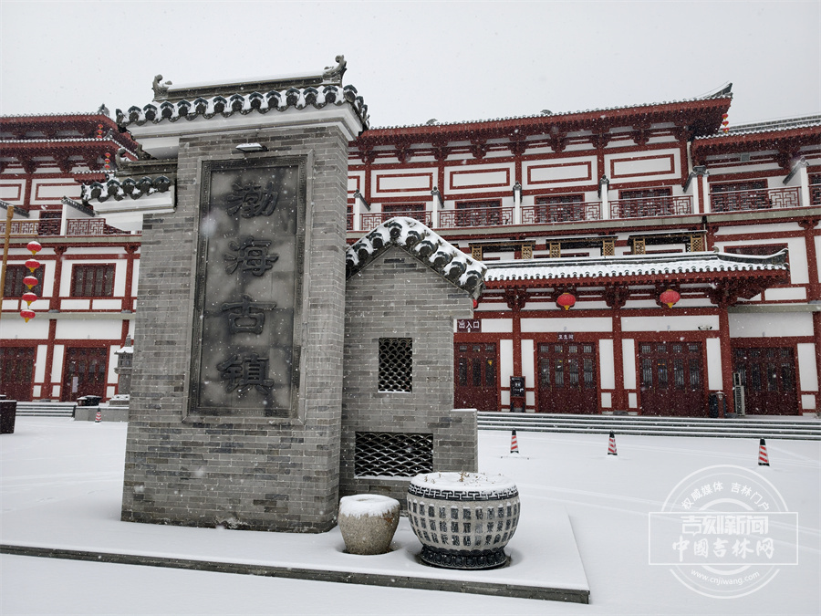 当雪花飘落,珲春渤海古镇散发出冬日限定的浪漫。唐式楼阁的飞檐斗拱覆上银霜,青石板路印满咯吱足音,红灯笼在白雪映衬下明艳动人,仿佛一幅徐徐展开的水墨画卷 。