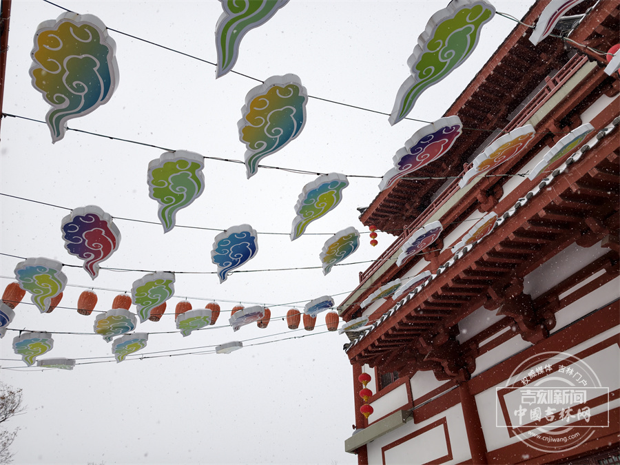 当雪花飘落,珲春渤海古镇散发出冬日限定的浪漫。唐式楼阁的飞檐斗拱覆上银霜,青石板路印满咯吱足音,红灯笼在白雪映衬下明艳动人,仿佛一幅徐徐展开的水墨画卷。