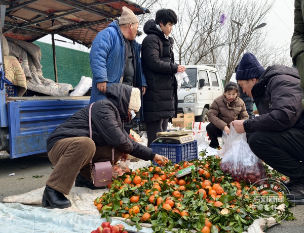 日用百货摊位、果蔬摊位同样人头攒动。服装鞋帽、锅碗瓢盆应有尽有,白菜、萝卜、苹果、橘子堆成堆。“我买点瓜子、糖、海鱼和对联,拿不动了,我先送回去,一会再来买点干货。”村民孙阿姨双手上拎着好几个塑料袋,脸上满是笑意,和她一同前来的是刚从外地儿子家回来的老邻居项阿姨,“就惦记着回来赶集,听听熟悉的吆喝声,这才是回家过年的感觉。”